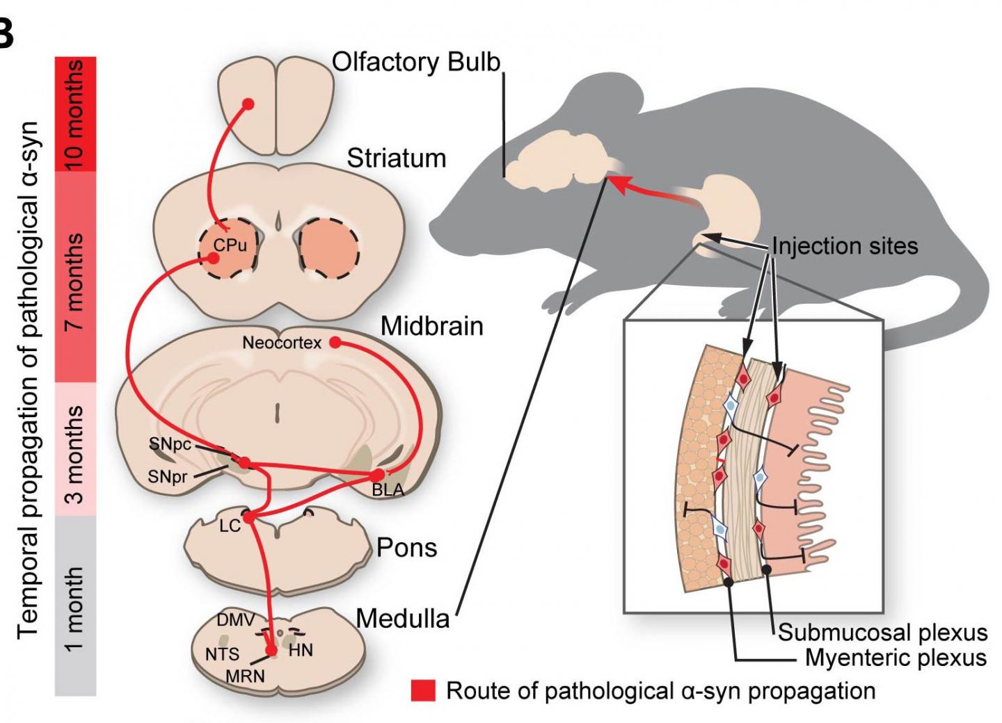 To test this, the researchers injected 25 micrograms of synthetic misfolded alpha-synuclein created in the lab into the guts of dozens of healthy mice. The researchers sampled and analyzed the mouse brain tissue at one, three, seven and 10 months after injection. Over the course of the 10 month experiment, the researchers saw evidence that the alpha-synuclein began building where the vagus nerve connected to the gut and continued to spread through all parts of the brain.