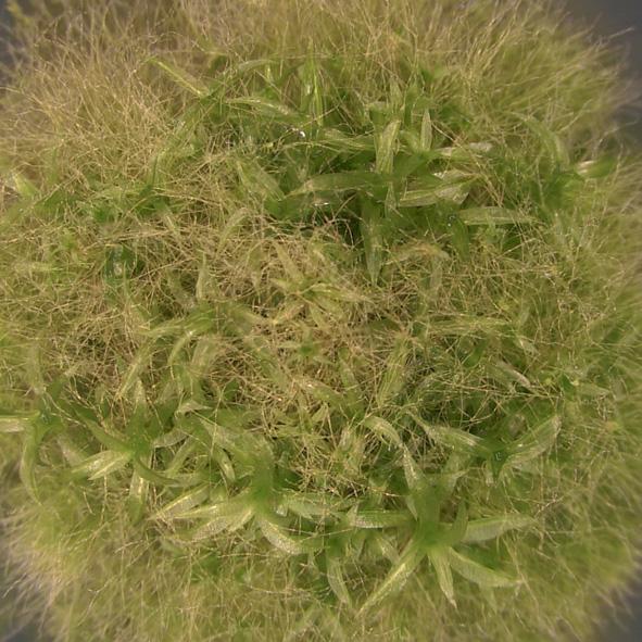 image: Filamentous protonema tissues (pale green) exhibit two dimensional growth to form a mat-like structure. On the other hand, gametophores (dark green) produce leafy shoots as a result of three dimentional growth.
