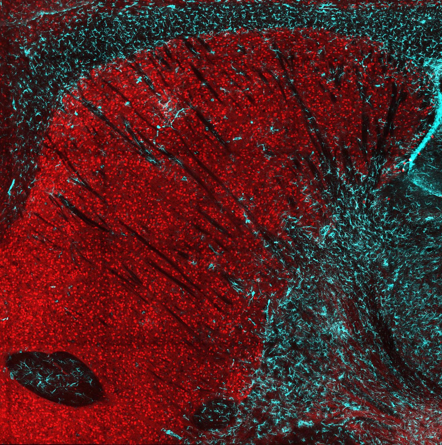 image: A cross-section of the striatum in a mouse brain. Loss of huntingtin protein in striatal neurons (red) causes neuron loss and an inflammatory response, shown by the infiltration of glial astrocytes (cyan).