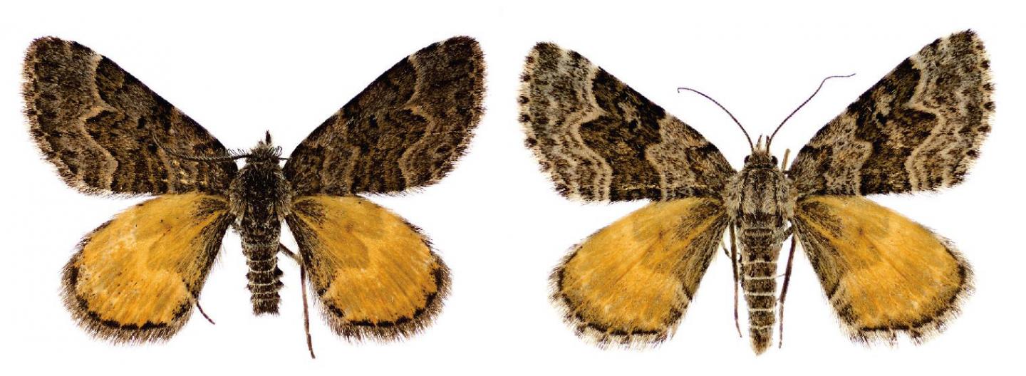 image: Male (left) and female (right) specimens of the newly described moth species Arctesthes titanica.