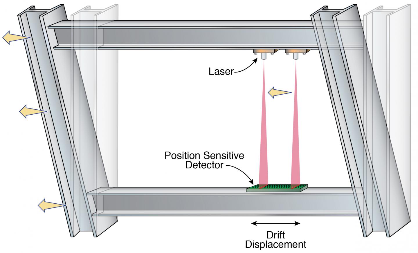image: A new sensor developed at Lawrence Berkeley National Laboratory combines laser beams with a position sensitive detector to directly measure drift between building stories, an essential part of assessing earthquake damages in a building and deeming them safe to reoccupy.
