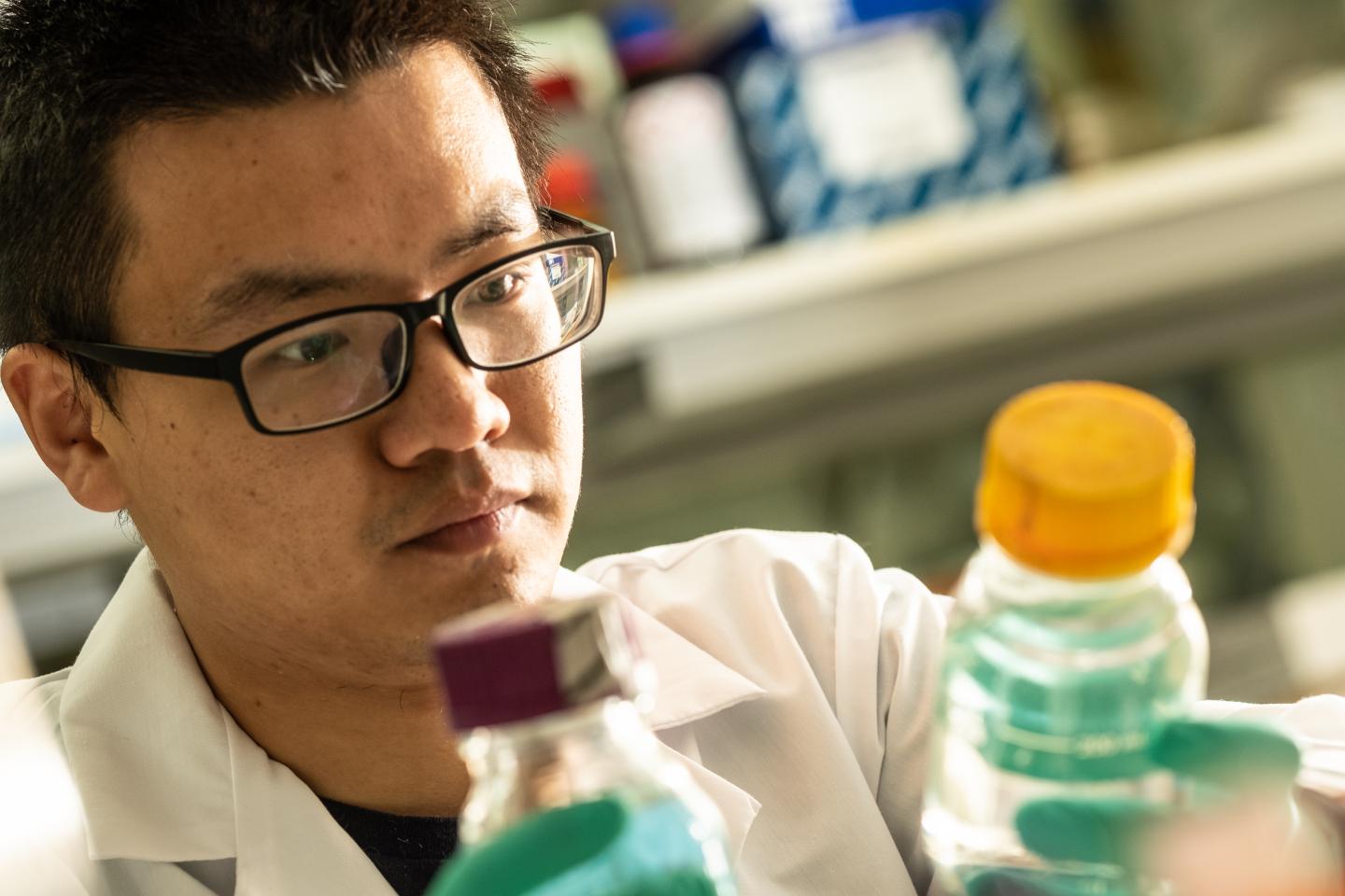 image: Rice University graduate student Danning Zhang, who led the development of a particle that attracts and degrades contaminants in water, checks a sample in a Rice environmental lab.