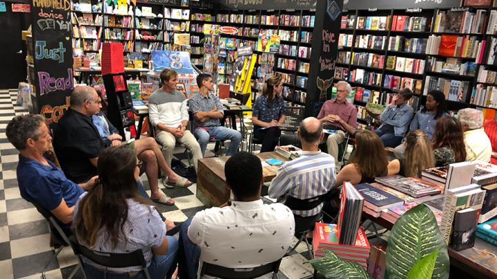 image: Katharine Mach, (center) Ph.D. associate professor of Marine Ecosystems and Society, engaging community members at an Underwater Homeowner's Association meeting about sea-level rise in Miami.