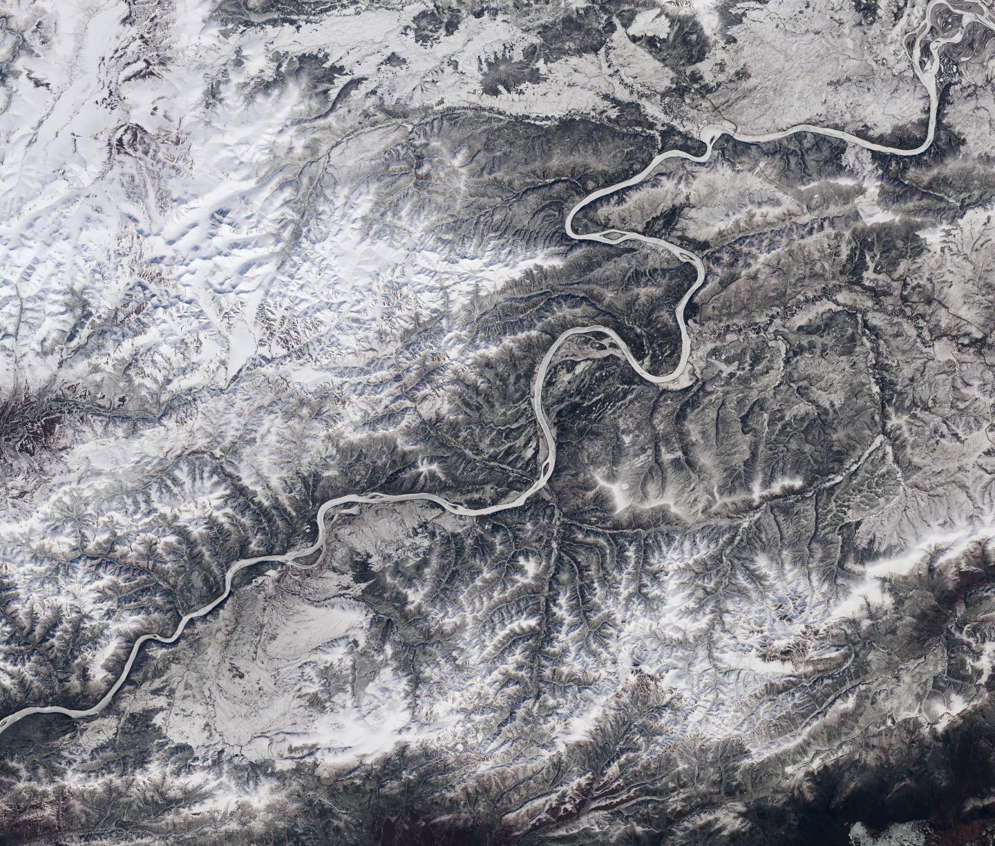 image: Ice cover on the Yukon River approaching its confluence with the Tanana River in Alaska.