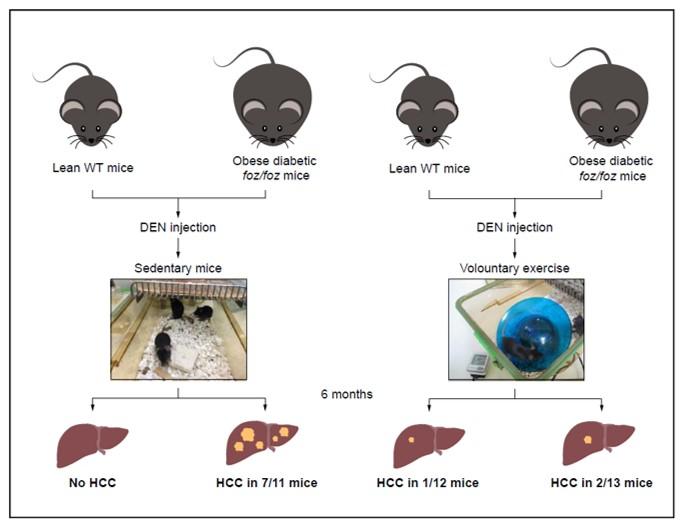 This research shows that exercise can stop development of liver cancer in mice that have fatty liver disease related to obesity and type 2 diabetes. Specifically, while nearly all obese mice injected with a low dose of a cancer-causing agent developed liver cancer within six months, mice that regularly exercised failed to do so. They were completely protected against liver cancer development in the timeframe of these experiments. Weight control did not mitigate the development of liver cancer.