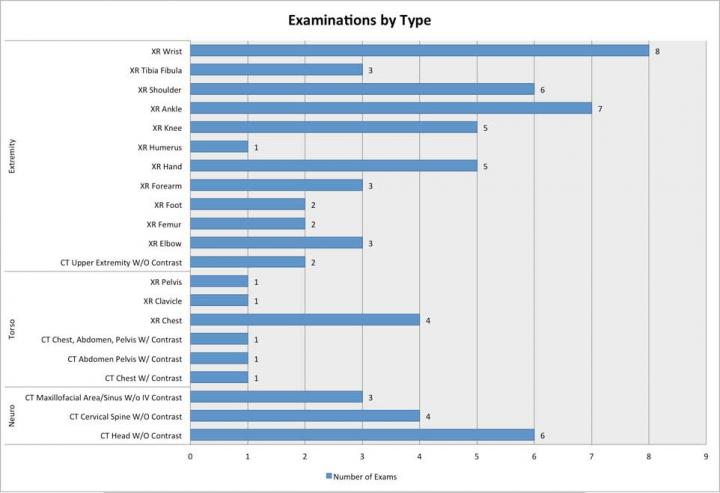 image: Bar graph of imaging examinations by type due to electronic scooter accidents.