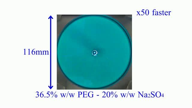 The research team succeeded in changing the miscibility of the system to fully miscible, immiscible, and partially miscible with little change in the viscosities at room temperature and atmospheric pressure. They used an aqueous two-phase system consisting of polyethylene-glycol (PEG), sodium-sulfate (Na2SO4), and water (see Figure), which were described in the same research team's paper published in 2019. Here, in the partially miscible system, a pure PEG solution and a pure Na2SO4 solution dissolve each other with finite solubility, and as a result, the phase is separated into a PEG-rich phase (phase L) and a Na2SO4-rich phase (phase H) (see Figure).
