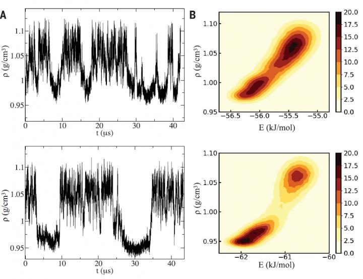 image: Fig A (left): Using two distinct computer simulations of water (top and bottom panels), researchers detected swings in density characteristic of supercooled water oscillating between two liquid phases that differ by density. Fig B (right): The simulations revealed a critical point between the two liquid phases, which are of different densities due to the presence of an extra water molecule in the high-density liquid.