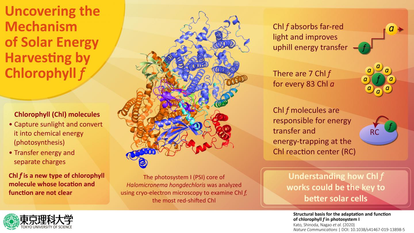 All living organisms need energy for their survival, and this energy indirectly comes from the sun. Some organisms, such as plants, cyanobacteria, and algae, are capable of directly converting this light energy into chemical energy via a process called "photosynthesis". These photosynthetic organisms contain special structures to mediate photosynthesis, called "photosystems". There are two photosystems that carry out light-energy conversion reactions, each of which is composed of a number of proteins and pigments. Among photosynthetic pigments, chlorophyll is the most crucial one, which not only captures light energy from the sun but also participates in the "electron transfer chain", a molecular pathway through which photons (from the sunlight) are converted into electrons (which are used as an energy source). There are different types of chlorophyll molecules, each having a specific function ranging from absorbing light and converting it into energy. Moreover, each chlorophyll molecule absorbs light in different regions. Recently, a new type of chlorophyll called Chl f was discovered, but details like exactly where it is located and how it functions have remained a mystery until now.