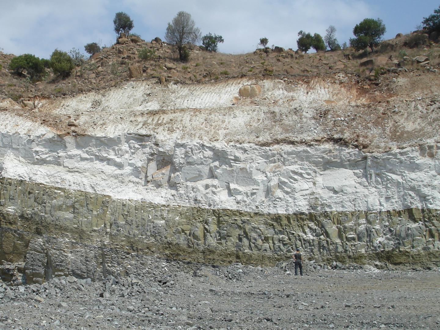 image: An example of a thick layer of stratiform anorthosite (white) from the world-known Bushveld Complex in South Africa.