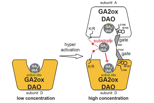 Under low substrate concentration (GA4 or IAA) (left), GA2ox or DAO functions as a monomer with low enzyme activity. At high substrate concentration (right), the interface GA4 or IAA causes the formation of multimers by bridging two enzyme molecules, resulting in hyper-activation. GA4 or IAA is retained in a stable interface position, allowing two subunits to enter the active site for the next reaction without a high energy barrier. Lys or Arg is the most important amino acid for retaining GA4 or IAA and for entering the active site. Furthermore, MD simulation of OsGA2ox3 revealed the presence of a gate, allowing substrate to enter the active site and for product to exit. This gate had a hinge site composed of three amino acids, W106, C186, and V196, and was also stabilized by the interaction between R97 in subunit A and F100 in subunit D. GA4-dependent dimerization enhanced its enzymatic activity. These mechanisms are conserved in all rice GA2oxs.