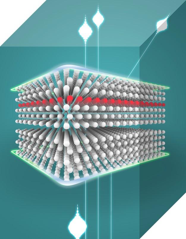 image: Rendering of a new topological ferromagnet that can be tuned into quantized conductivity state using high-energy electron beams.
