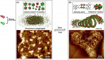 Spectral measurements revealed that this higher-order structural change was due to the composition of the rosette units that make up the polymer. Homopolymers consisting only of electron-rich molecules (red molecules in Fig. 1) are energetically stabilized by forming a stable ring structure, and integrated rosettes are further stabilized by coaggregation. Bonds between the rosettes are strengthened by energetic stabilization and they grow into a helicoidal structure rather than stopping at rings.