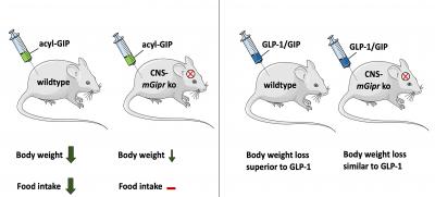 The researchers were able to show that the administration of GIP reduces body weight and food intake in wild-type mice, but not in mice that lack the GIP receptor in the central nervous system.
