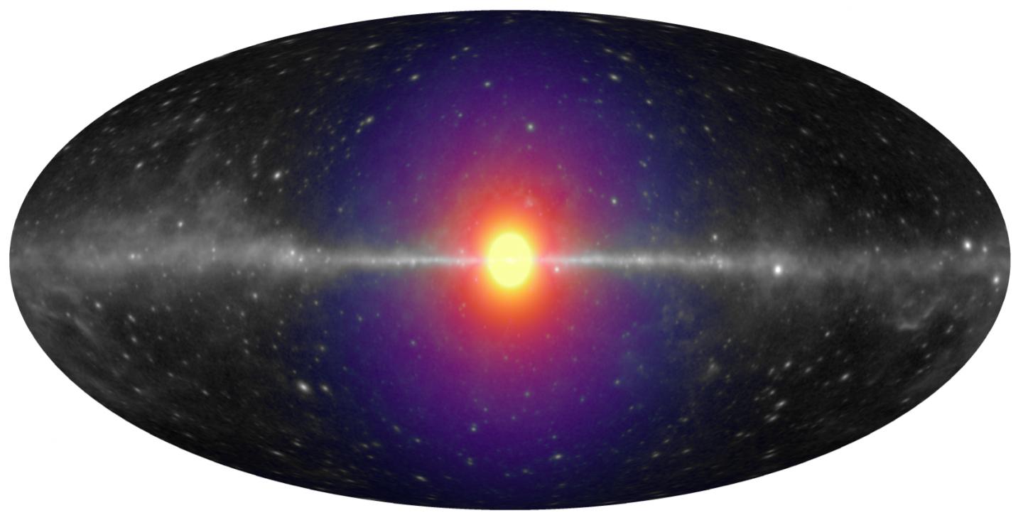 image: In this composite image, theorized particles of decaying dark matter should produce a spherical halo of X-ray emission - represented here as colorized matter concentrated around the center of the Milky Way (in black and white) - that could be detectable when looking in otherwise blank regions of the galaxy.