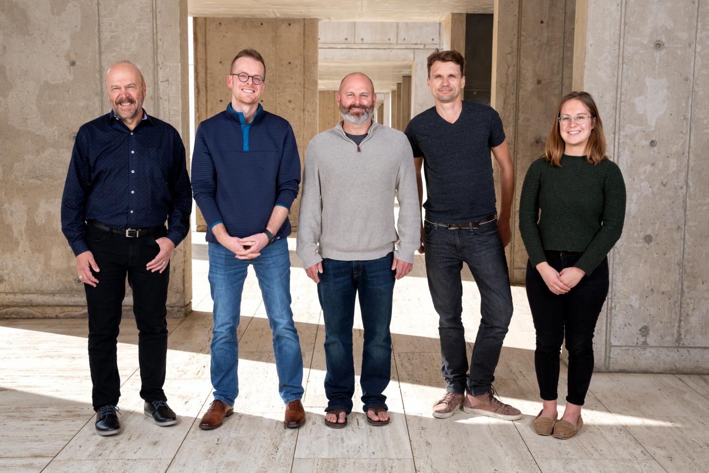 image: Researchers used the latest DNA sequencing technologies to study exactly what happens at a molecular level when they insert new genes into plants. From left: Joseph Ecker, Florian Jupe, Todd Michael, Mark Zander and Angeline Rivkin.