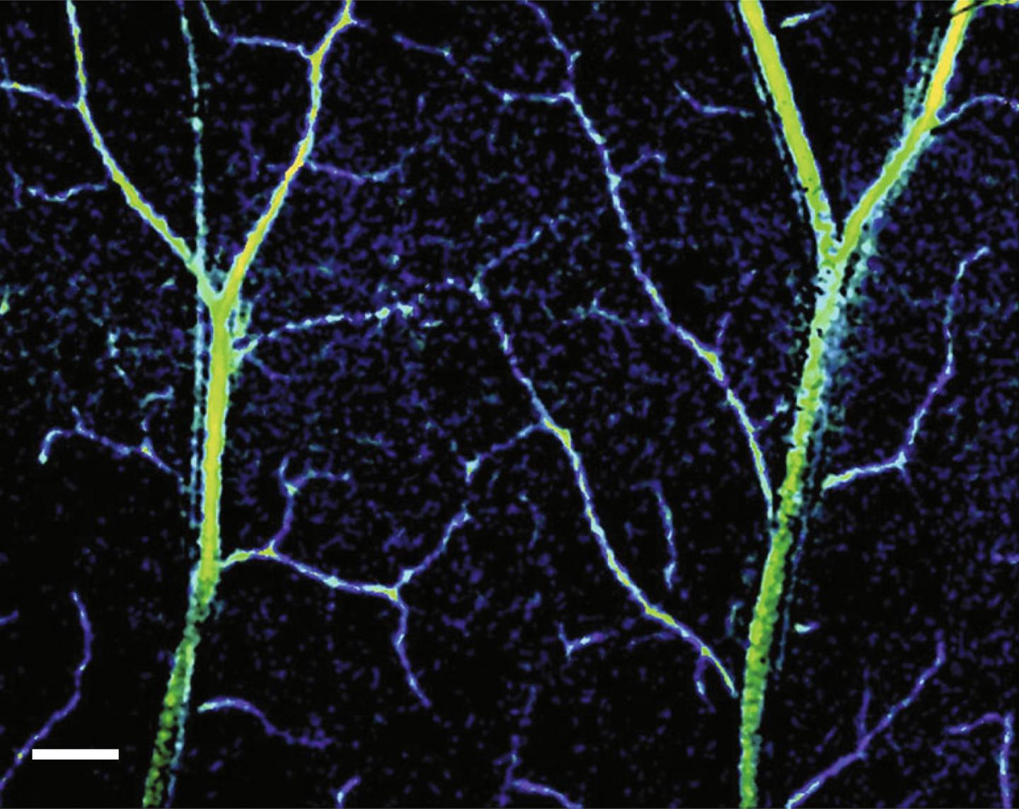 image: An image of capillaries taken with spectral contrast optical coherence tomography angiography, which is the first technology to capture blood flow and oxygen exchange.