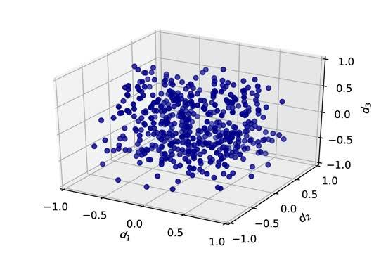 The three dimensions correspond to three political issues (e.g., marihuana legalization, gay marriage, or income taxation). The space spanned by these dimensions is the "opinion space." Each blue dot represents an individual. From random positions, individuals rapidly converge in the middle of the opinion space (where all three issues are irrelevant).