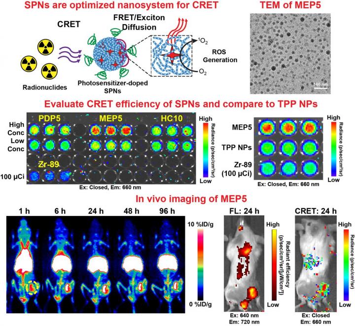 Researchers found that semiconducting polymer nanoparticles optimized with photosensitizers dramatically intensified Cerenkov luminescence to kill cancer cells. Positron emission tomography and optical imaging studies also clearly visualized tumor uptake of these optimized semiconducting polymer nanoparticles. This approach was found to have excellent potential as a cancer theranostics nanosystem without any tissue penetration limits.