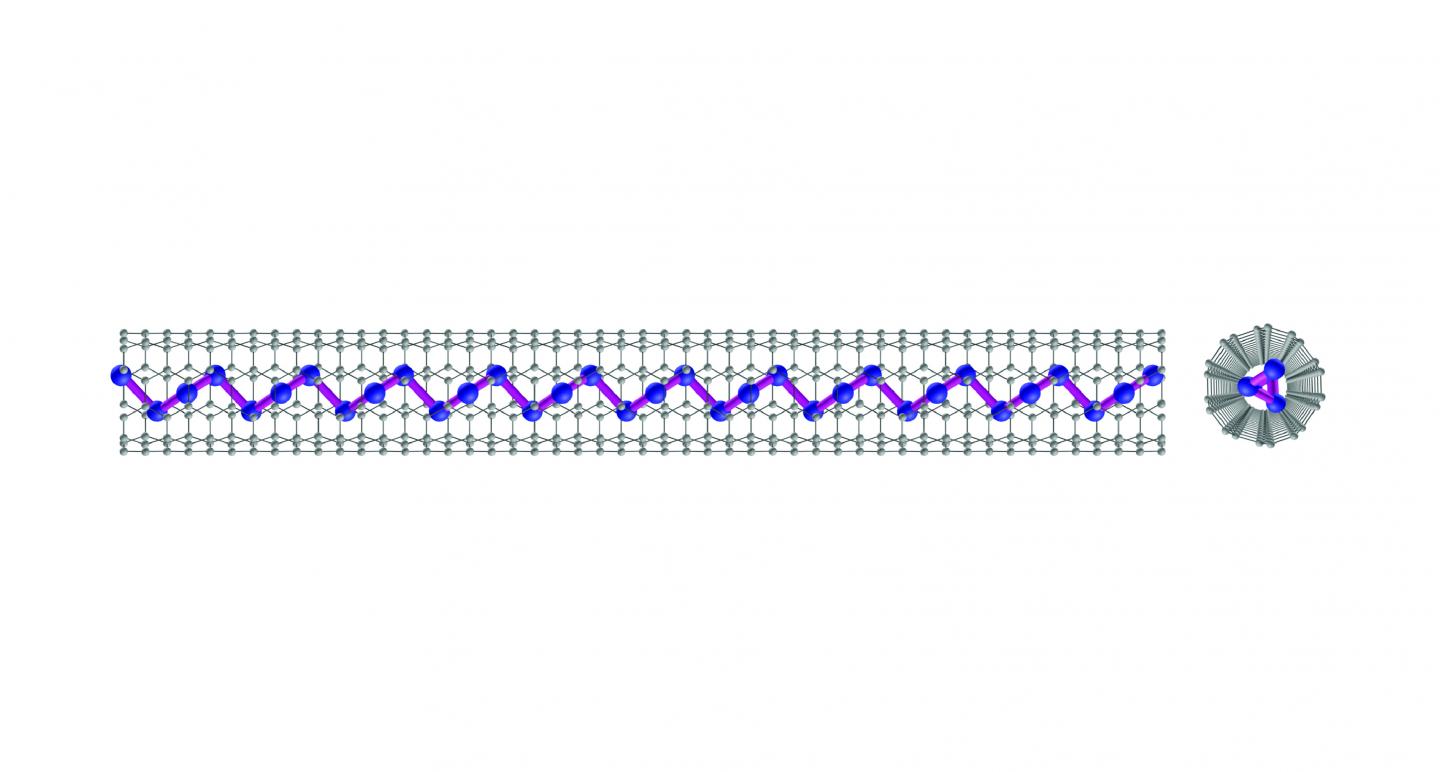 image: Researchers have discovered that a material forms a DNA-like helix when reduced to a string of atoms, as seen by the pink line in this graphic, encapsulated in a nanotube.
