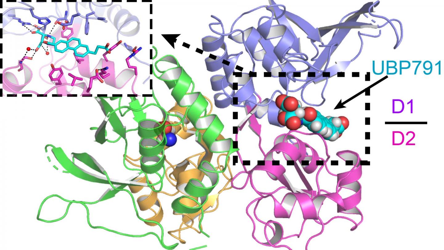 image: After seeing exactly how the chemical compound UBP791 fits into a subunit (D1/D2) of an NMDA brain receptor (as visualized above by Furukawa's lab) chemists can now work on designing a version of the compound that fits into that subunit and no others. In this way, they work towards a level of chemical specificity ideal for experiments and drug design.