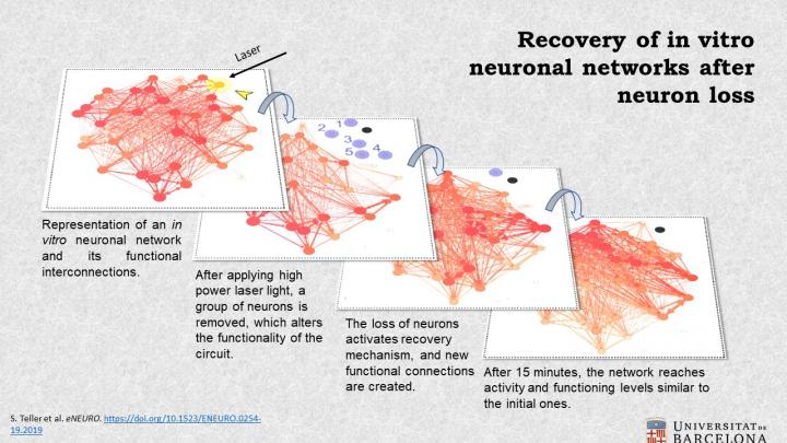 Researchers saw that the closest group of neurons to the affected area loses activity immediately, but it regains activity gradually thanks to the action of the whole network. "Surprisingly, in only fifteen minutes this group reaches activity levels that are similar to the ones from before the damage took place, despite having lost a significant number of impulses from the affected area", says Soriano. "Since fifteen minutes are not enough -continues the researcher- to set new connections, we conclude that the network acts by reinforcing the existing connections, re-driving the flow of neuronal stimuli to the neighbours of the affected area, preventing their deterioration from happening, and therefore, a progressive collapse of the network".