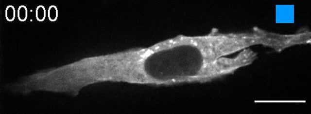video: This time-lapse movie shows a new tool called an OptoBinder that can latch onto and release molecules in response to light. In this case, a fluorescent OptoBinder is attaching to actin, a component of cells key to their structure and shape. The OptoBinder strongly binds to actin in the dark, but releases its hold in the presence of blue light (indicated by blue box at top right).
