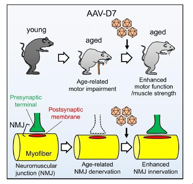 They previously demonstrated that the muscle protein Dok-7 (*2) plays an essential role in NMJ formation, and, indeed, its forced expression in muscle enlarges NMJs. Moreover, therapeutic administration of an adeno-associated virus vector encoding human Dok-7 (DOK7 gene therapy) suppressed muscle denervation and enhanced motor activity in a mouse model of amyotrophic lateral sclerosis (ALS). Here, they show that DOK7 gene therapy significantly enhances motor function and muscle strength together with NMJ innervation in aged mice.