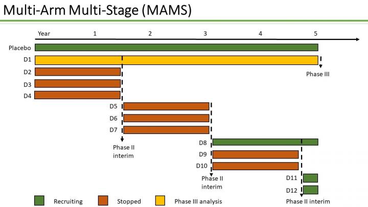The authors stress that to maximize the potential of a MAMS platform trial running over many years and interrogating many research questions, it is crucial that there is a pipeline in place that will continuously identify and evaluate suitable drug candidates. Furthermore, outcome measures have to be chosen that are sensitive enough to changes in disease progression over interim stages as well as the full duration of the trial.
