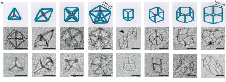 image: Models and transmission electron microscopy (TEM) images of various 3D polyhedra that were constructed by connecting the self-linked triangular M-DNA and rectangular M-DNA. From left to right: a tetrahedron, triangular bipyramid, octahedron, pentagonal bipyramid, triangular prism, rectangular prism, pentagonal and hexagonal prisms