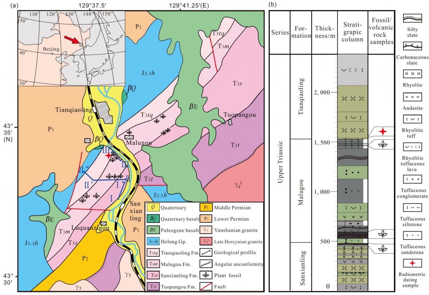image: Late Triassic volcanic-sedimentary strata of Tianqiaoling flora revealed by the geological profiles. (a) Locations of plant fossil-bearing beds and volcanic rock radiometric dating samples. (b) The synthetic column showing the lithological and paleobiostratigraphic characteristics of Daxinggou Group.