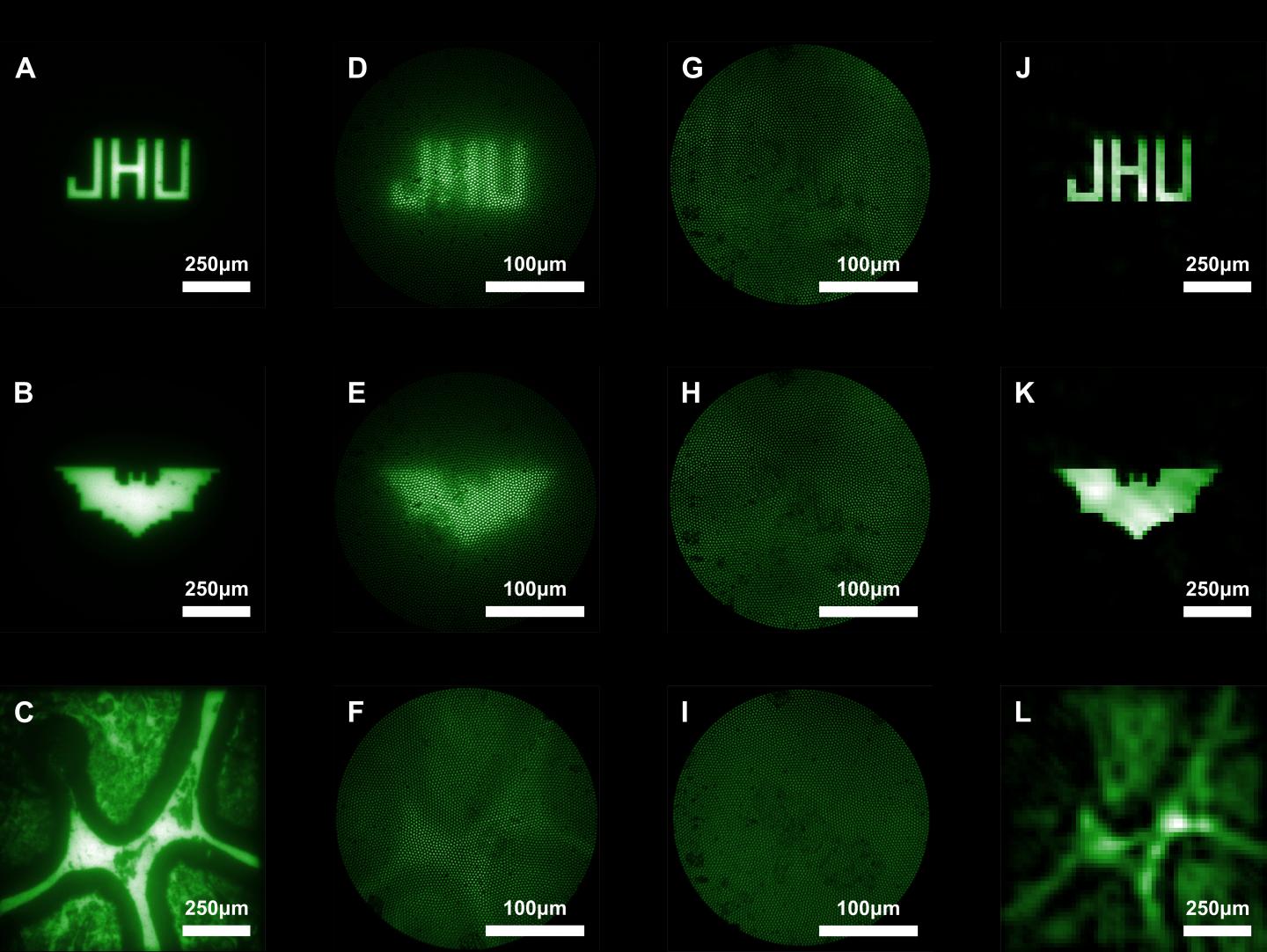 image: A to C shows beads on a slide imaged by a bulk microscope. D to F are the beads when viewed from a conventional lens-based microendoscope. G to I are the raw images from the research team's new ultra-miniaturized lens-free microendoscope. The researchers say these images are terrible but actually provide a great deal of information about light coming through that can be used in computational reconstruction to piece together a clearer final image. J to L are images G to I after computational reconstruction.