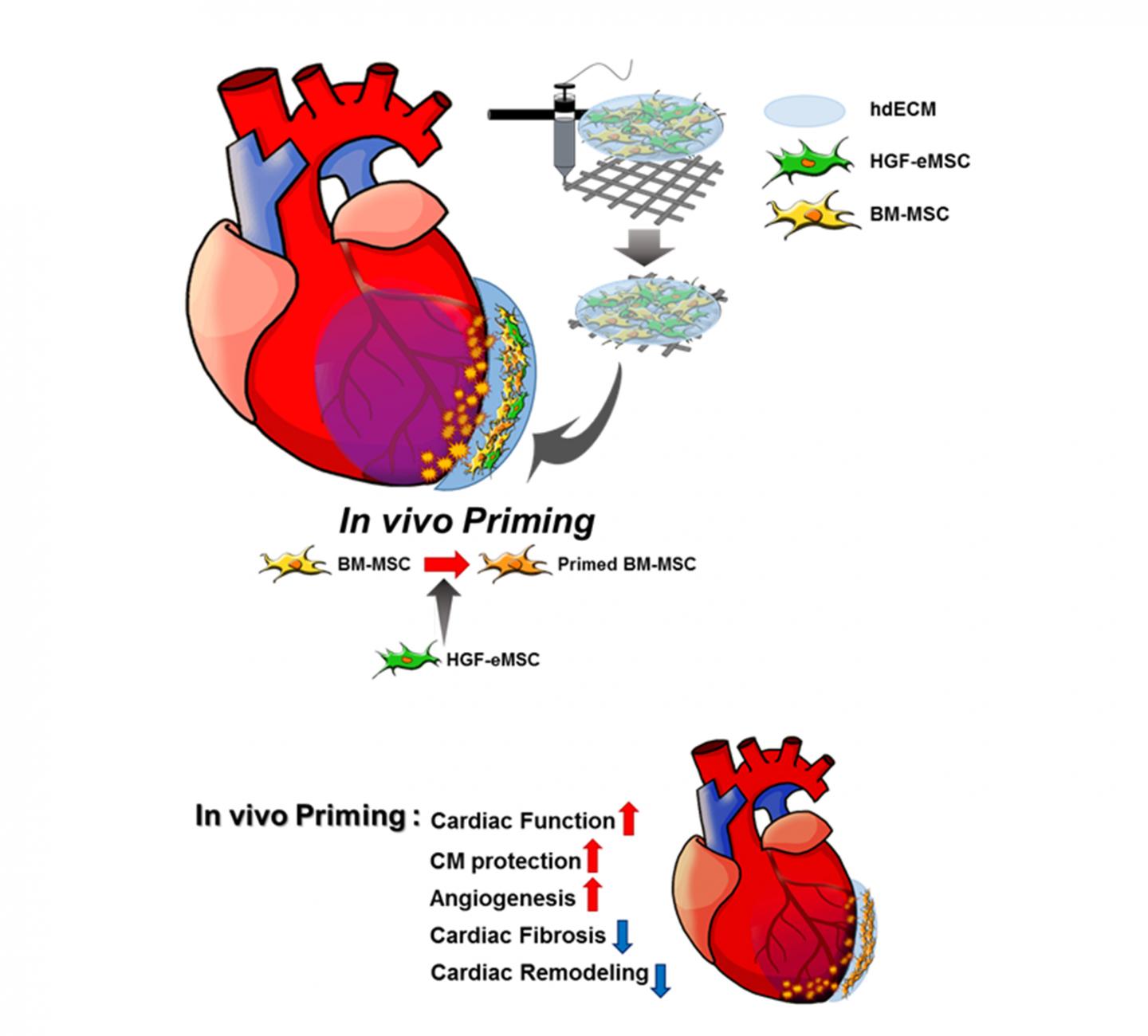 It was found that the primed hMSCs had a higher survival rate compared with unprimed ones in the patches attached to the failing hearts. Those empowered hMSCs released greater amounts of paracrine factors beneficial for repairing damaged cardiac muscle tissues and regenerating vasculatures.