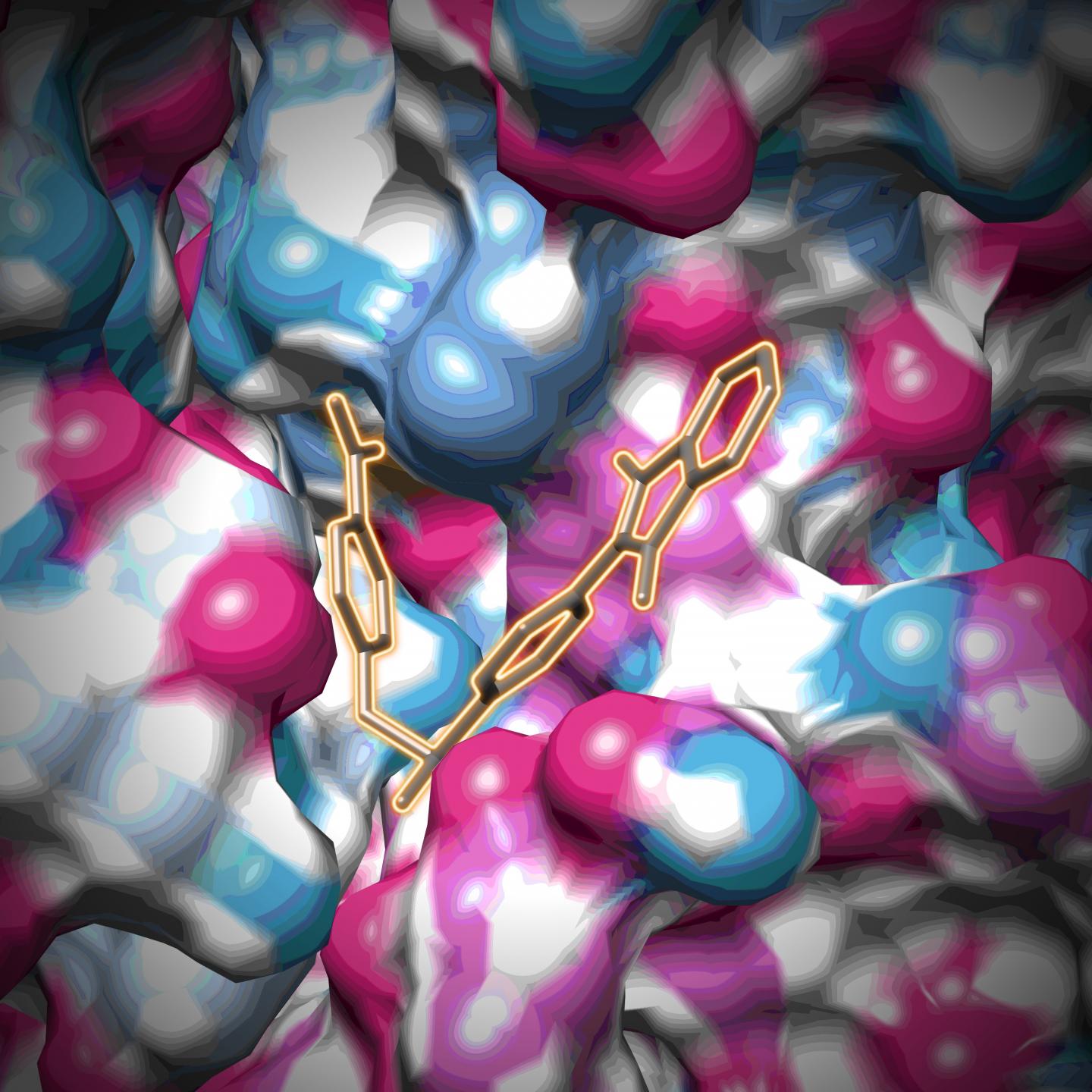 image: This image shows a small molecule drug (highlighted) in its binding pocket on a target picornavirus capsid (Coxsackievirus B3), as determined by cryo-electron microscopy. The electrostatics of the virus capsid surface are shown as a magenta-cyan spectrum.