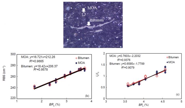 image: MOA and solid bitumen in shales, and relationships between their Ramm parameters (RBS?ID/IG) and bitumen reflectance (BRo).