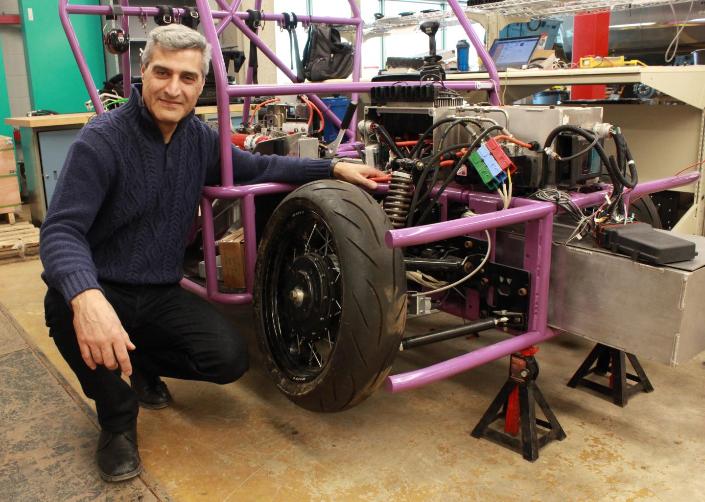 image: Prof. Amir Khajepour stands next to a vehicle containing his new wheel unit.