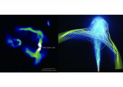 image: The bent jet structures emitted from MRC 0600-399 as observed by the MeerKAT radio telescope (left) are well reproduced by the simulation conducted on ATERUI II (right). The nearby galaxy B visible in the left part of the MeerKAT image is not affecting the jet and has been excluded in the simulation.