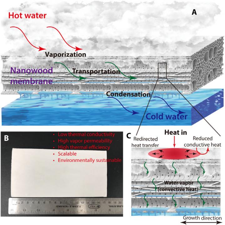 Most membranes that are used to distill fresh water from salty are made of polymers, which are derived from fossil fuels and are also difficult to recycle. The wood membrane is a more sustainable material, and according to the researchers, has very high porosity, which promotes water vapor transport and prevents heat loss. In a paper published Aug. 2 in the journal Science Advances, the researchers demonstrate that the new membrane they designed performs 20% better than commercial membranes in water distillation tests.