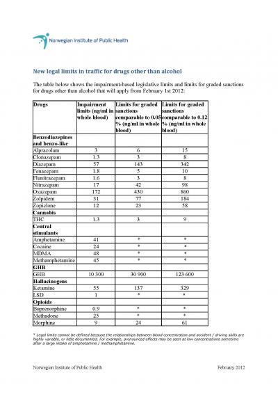 Legal limits for twenty illegal drugs and medicines with an abuse potential have been introduced by the Norwegian government. Norway is the first country to define both impairment-based legislative limits and limits for graded sanctions for drugs other than alcohol. The Norwegian Institute of Public Health participated to provide the scientific basis for the new limits.