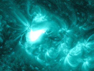 The Solar Dynamics Observatory captured this image of an M1.2 class flare on June 13, 2012. The sun is shown here in teal as this is the color typically used to represent light in the 131 Angstrom wavelength, a wavelength particularly good for observing flares.