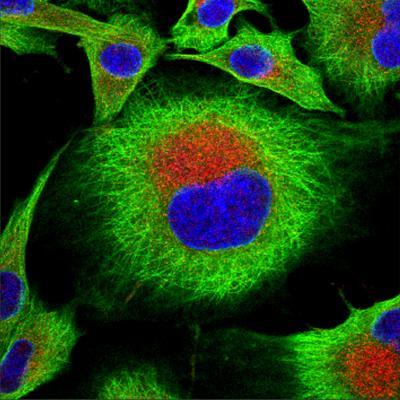 Foot-and-mouth disease virus (red) replicates near the nucleus (blue) of an infected cell.