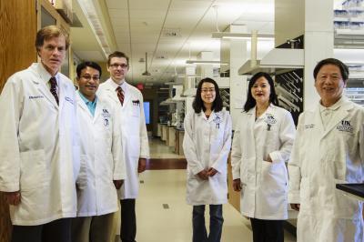 The research team on this study includes (L-R) Markey Cancer Center Director Dr. Mark Evers, Farzin Haque, Dr. Piotr Rychahou, Yi Shu, Dan Shu and Peixuan Guo.