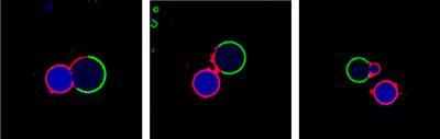 A new technique that constructs models of primitive cells has demonstrated that the structure of a cell's membrane and cytoplasm may be as important to cell division as a cell's enzymes, DNA, or RNA. The study, which will be published in the Journal of the American Chemical Society, may provide important clues to how life originated from non-life and how modern cells came to exhibit complex behaviors. This image shows the second-generation division in the model-cell. The initial division was followed by budding of one of the daughter cells. The small bud contains a newly-formed dextran-rich aqueous phase coated by the red membrane domain, while the larger body of the model cell contains the PEG-rich aqueous phase coated by the green membrane domain.