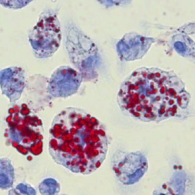 When macrophages take up massive amounts of cholesterol they form foam cells, characterized by multiple lipid droplets (stained red).