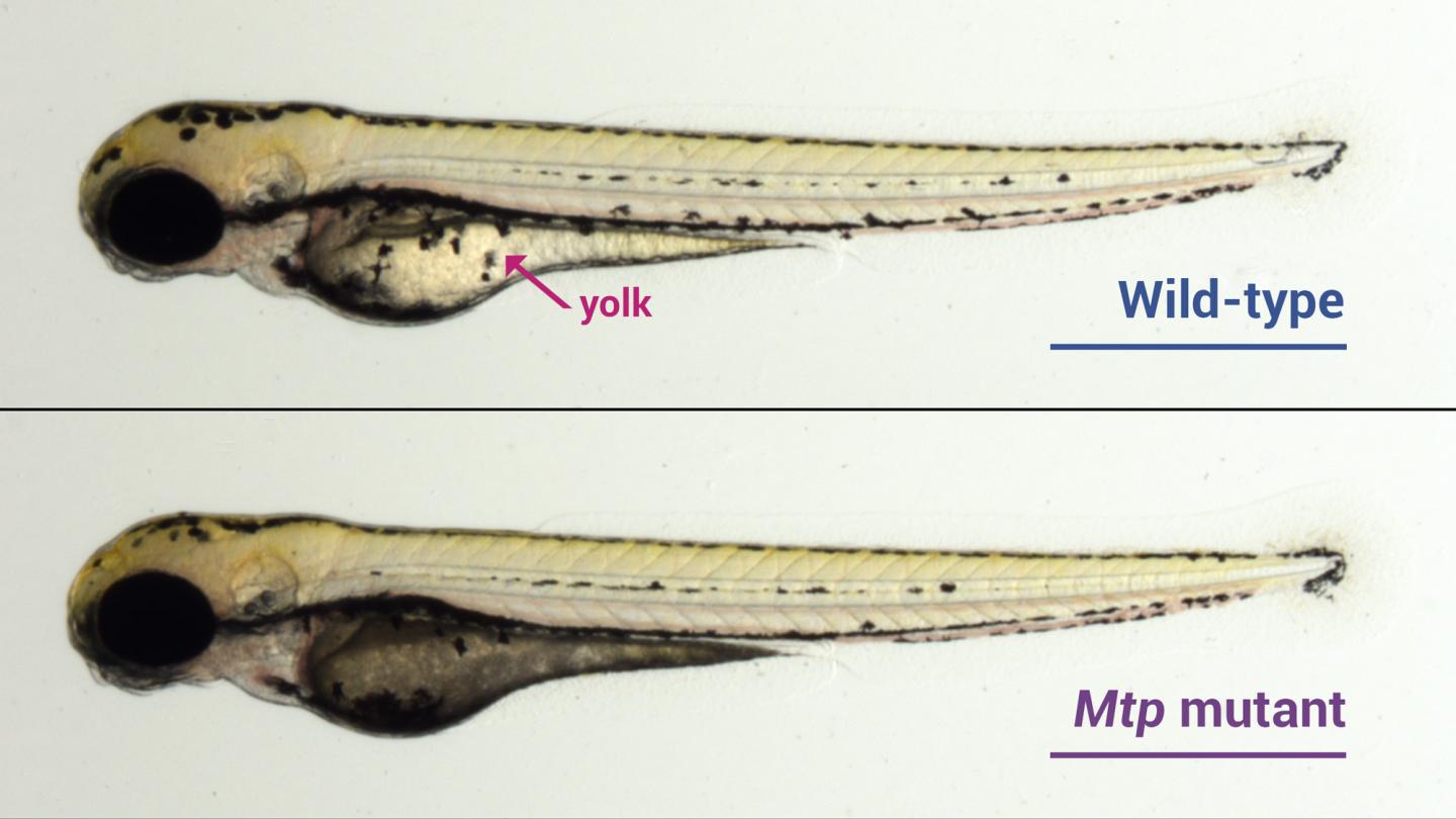 image: ApoB-containing lipoproteins carry lipid from the yolk of a zebrafish through the circulation to the growing tissues of the embryo. Later in development, they will also carry lipids from the intestine and liver. While normal, wild-type, zebrafish have clear yolks (top image), zebrafish with mutations in Mtp have abnormally opaque yolks because they have difficulty synthesizing triglyceride-rich ApoB-containing lipoproteins and moving lipid from the yolk to body tissues.