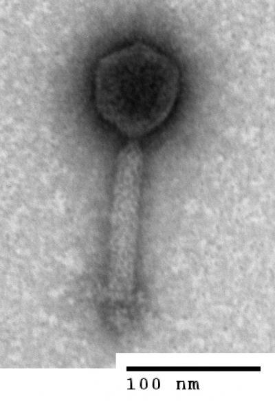 Bacteriophages come in different shapes and sizes. This one has a "head" containing the virus' DNA and a "tail" with which it attaches to bacterial cells when it infects them. The scale bar in this electron microscope image is about one thousandth the diameter of a human hair.