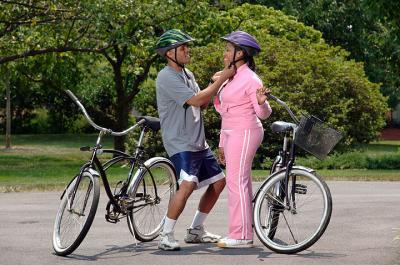 An African-American man adjusts an African-American woman's helmet strap as they prepare for a bicycle ride.