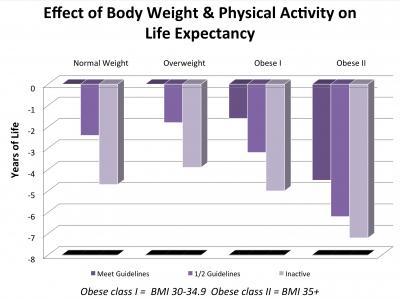 This bar graph displays years of life loss at various body weights and levels of activity. A study by the National Cancer Institute found that physical activity increased life expectancy, regardless of body weight.