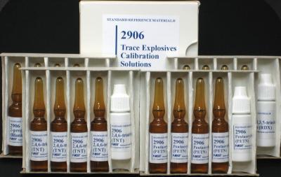 SRM 2906 includes four ampoules of each of the three explosives and a blank along with a dropper bottle for each. NIST researchers formulated the concentrations of these solutions to be near but above the detection limit of commercial swipe-type detectors, which are commonly based on ion mobility spectrometry.