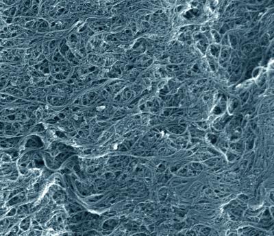 Scanning electron microscope image of a typical sample of the NIST single-wall carbon nanotube soot standard reference material. Recent NIST research suggests that, at least in the laboratory, carbon nanotubes may help protect DNA molecules from damage by oxidation. The image shows an area just over a micrometer wide. (Color added for clarity.)